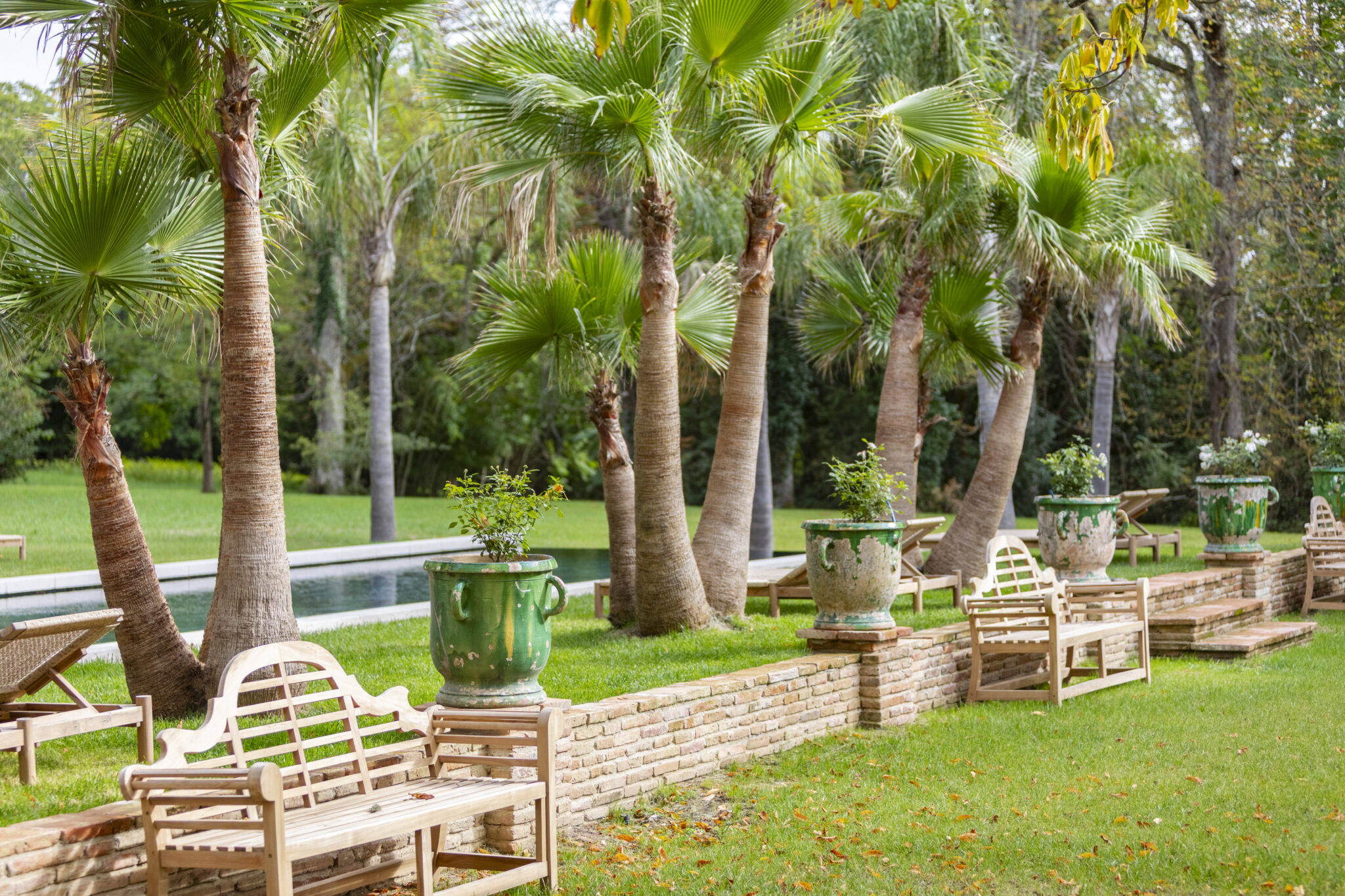 Face à la piscine, la serre offre une ambiance tropicale et lumineuse, entre jardin d’hiver, verrière et solarium.